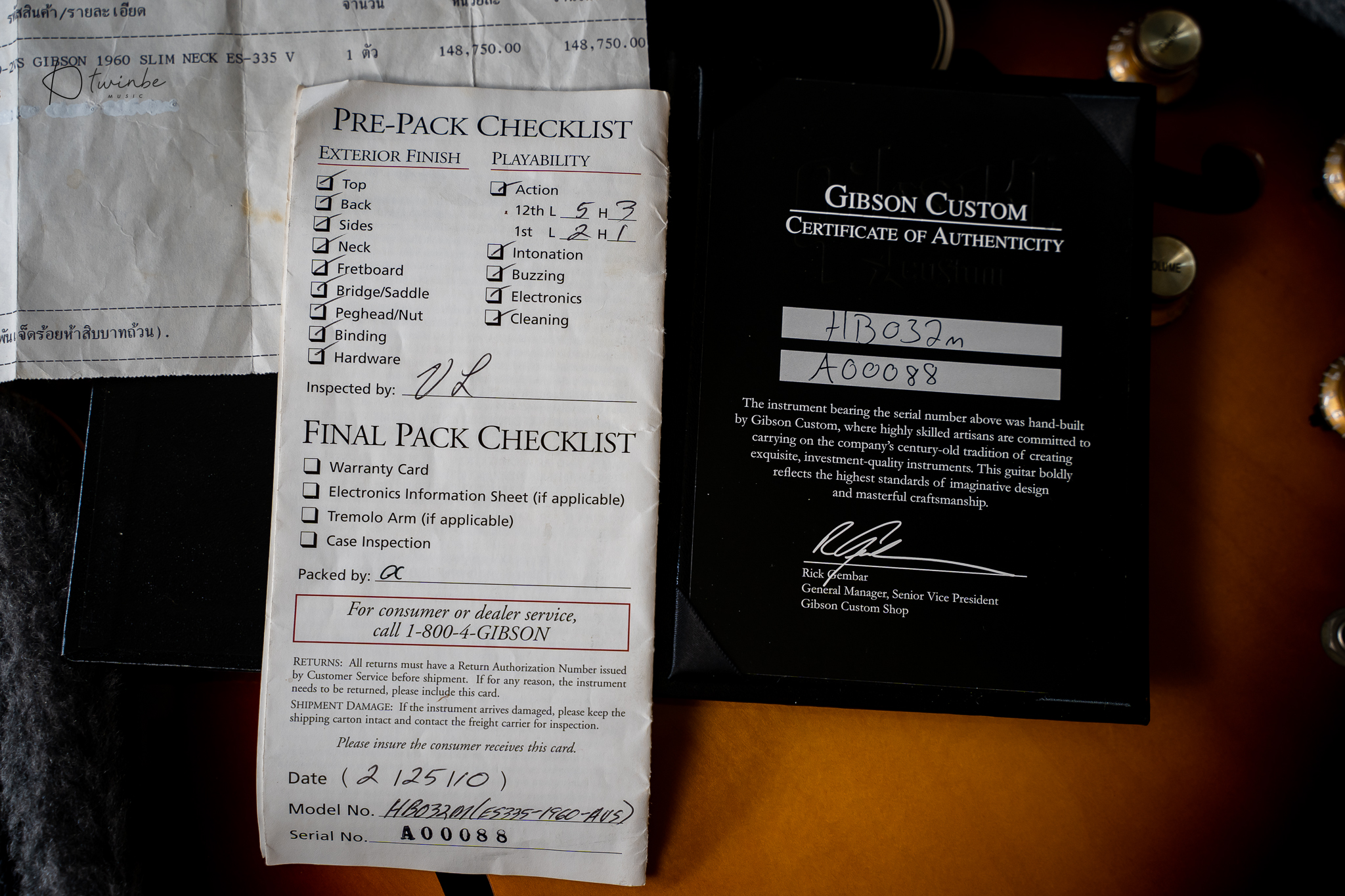 2010 Gibson Custom Shop 50th Anniversary 1960 ES-335 Reissue สี Antique Vintage Sunburst กีต้าร์รุ่นพิเศษที่ทำออกมาฉลองครบรอบ 50 ปีของ 1960 Gibson ES335 สภาพสวย เสียงดีมากๆ มาพร้อมกล่อง,Certificate และเอกสารครับ