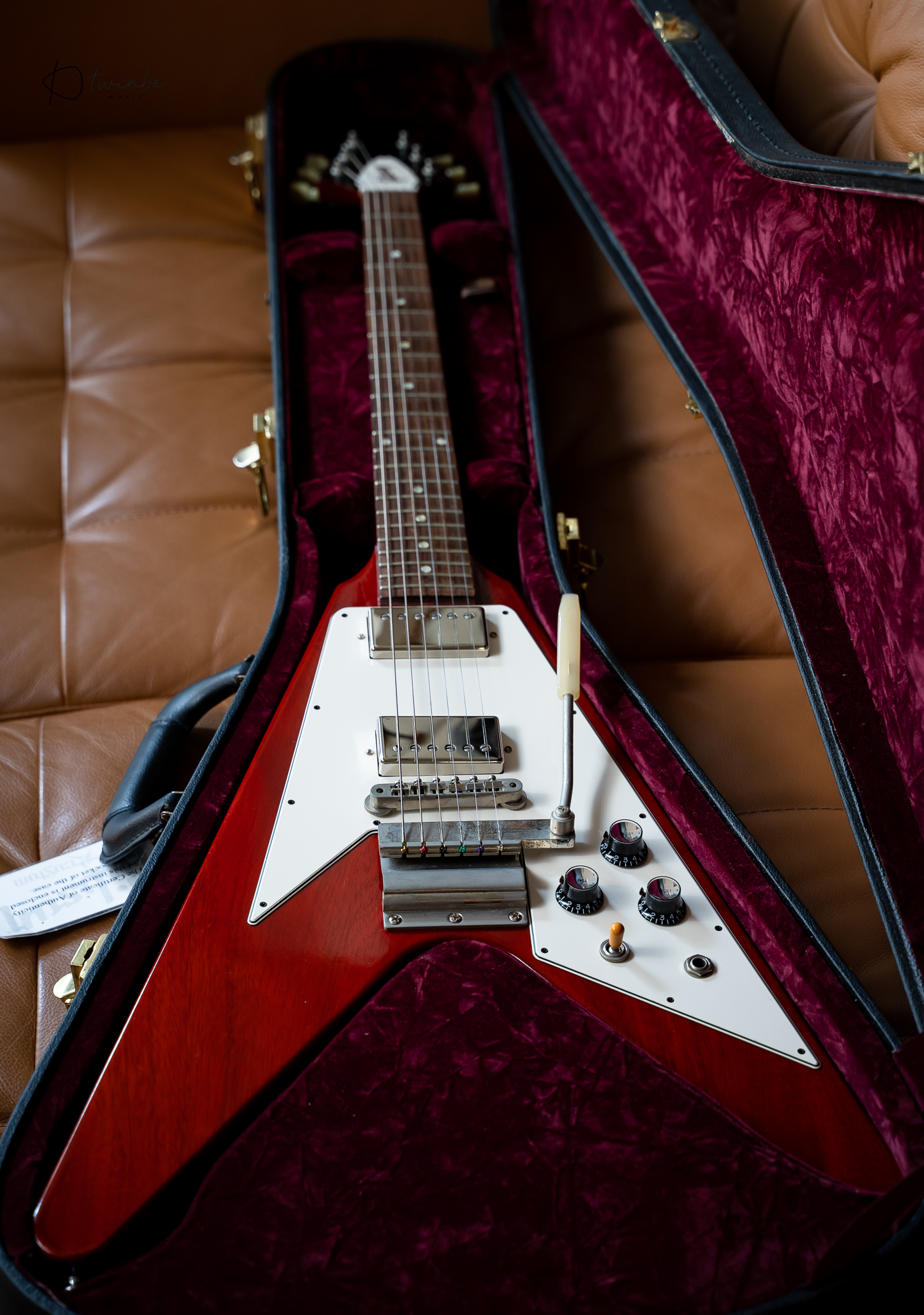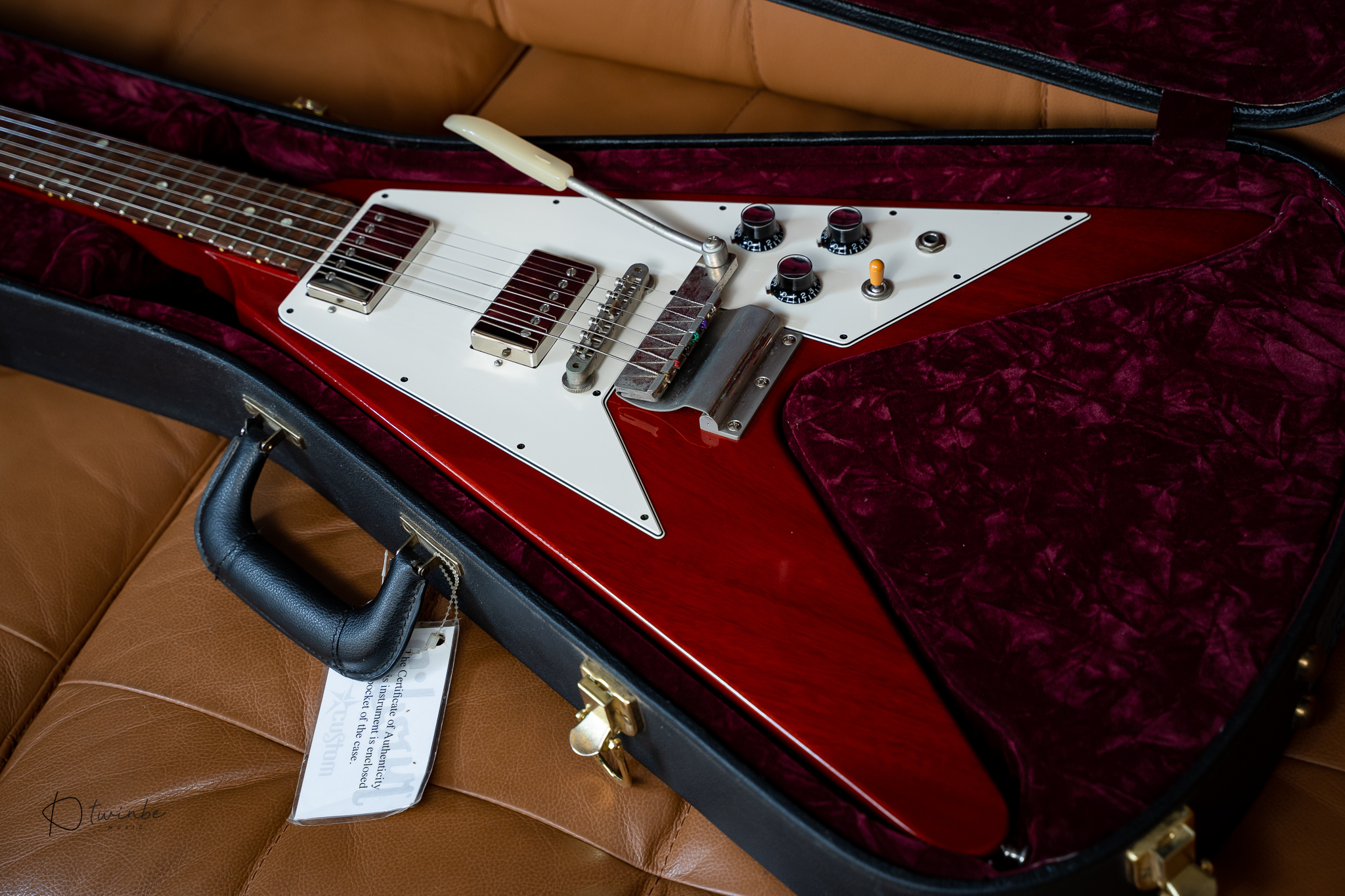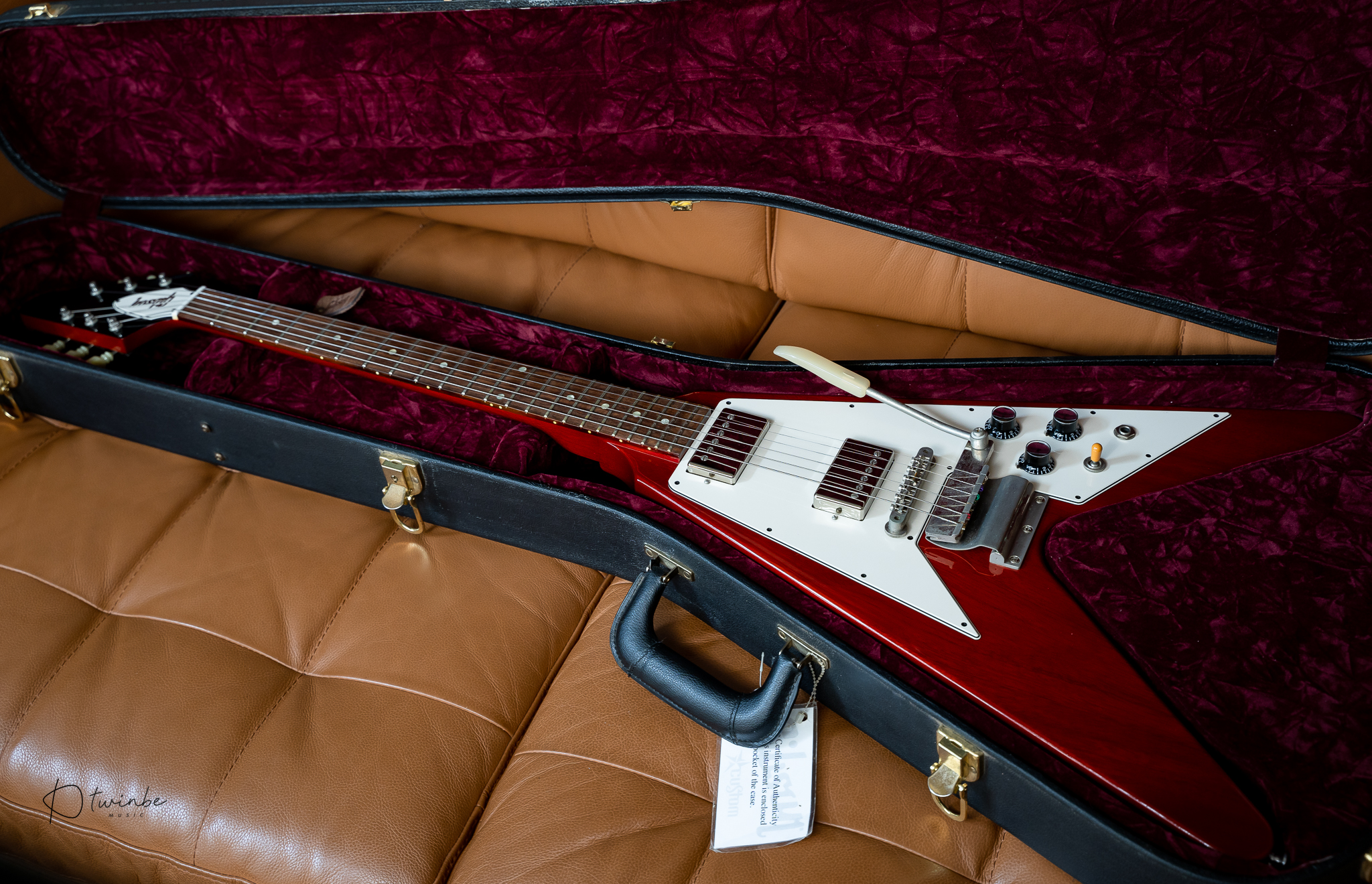 Gibson Custom Shop 1967 Reissue Flying V with Maestro Vibrola ผลิตปี 2020 จัดทำโดยอิงสเปคของ 1967 Flying V ยุคเดียวกับ "Psychedelic V" ของ Jimi Hendrix ใช้ในสมัยนั้น กีต้าร์สภาพเก็บสะสม น้ำหนักเบามาก (3.09 kg) เสียงดีแบบสุดๆ ความพิเศษอีกอย่างตัวนี้ serial number เลขสวยมาก #000007 เข้าใจว่าเป็นตัวแรกของรุ่นนี้ในปี 2020 มาพร้อมกล่อง , Certificate ,และเอกสารครบครับ